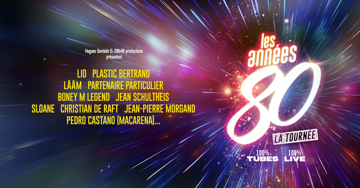 Les Années 80, La Tournée c’est une grande fête 100% Live avec LIO, PLASTIC BERTRAND, PARTENAIRE PARTICULIER, BONEY M LEGEND, JEAN SCHULTHEIS, SLOANE, CHRISTIAN DE RAFT, JEAN-PIERRE MORGAND, LÂÂM & PEDRO CASTANO.