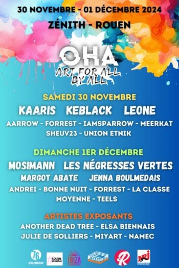 OHAfestival vous présente la 2ème édition de son festival d’Arts les 30 novembre et 1er décembre 2024 au Zénith de Rouen. Cette édition met en avant 16 artistes Normands qui ont été sélectionnés par le public pour se produire aux côtés de Keblack, Kaaris, Jenna Boulmedais, Leone, Mosimann, Margot Abate…